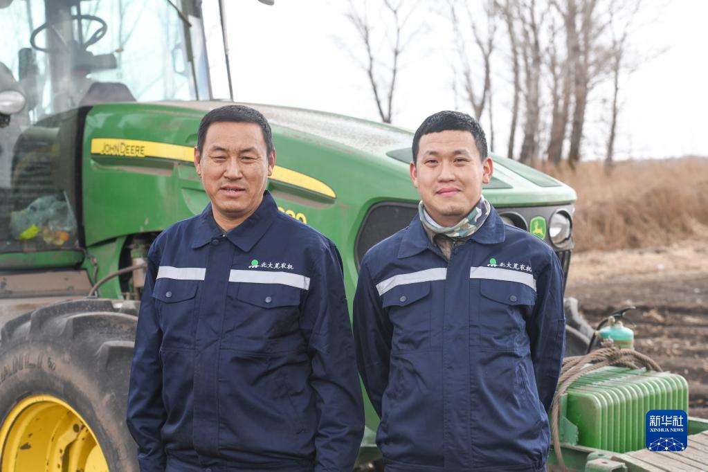 4月12日,在建設(shè)農(nóng)場(chǎng)有限公司一處農(nóng)田旁,許志國(guó)(左)與兒子許呈浩在大型拖拉機(jī)前合影。2019年,在外地工作的許呈浩回到建設(shè)農(nóng)場(chǎng)有限公司第四管理區(qū),協(xié)助父親許志國(guó)進(jìn)行春耕與秋收等農(nóng)業(yè)生產(chǎn)作業(yè)。