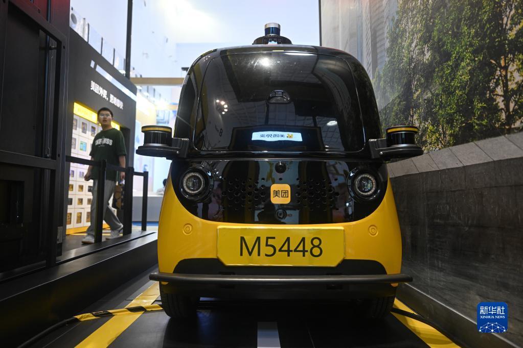 這是4月13日在美團(tuán)展臺(tái)拍攝的自動(dòng)配送車。