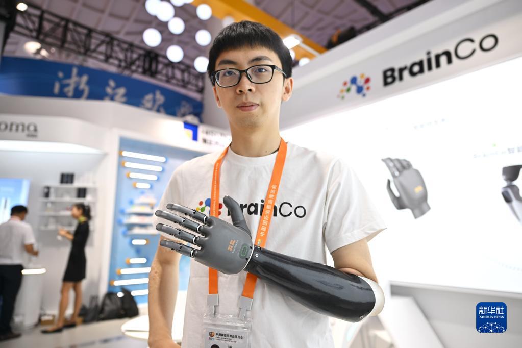 4月10日,參展商在浙江展臺展示一款智能仿生手。