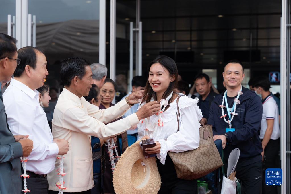4月13日,在中老鐵路老撾磨丁站,老撾官員和工作人員歡迎乘坐D887次國際旅客列車的旅客抵達磨丁。