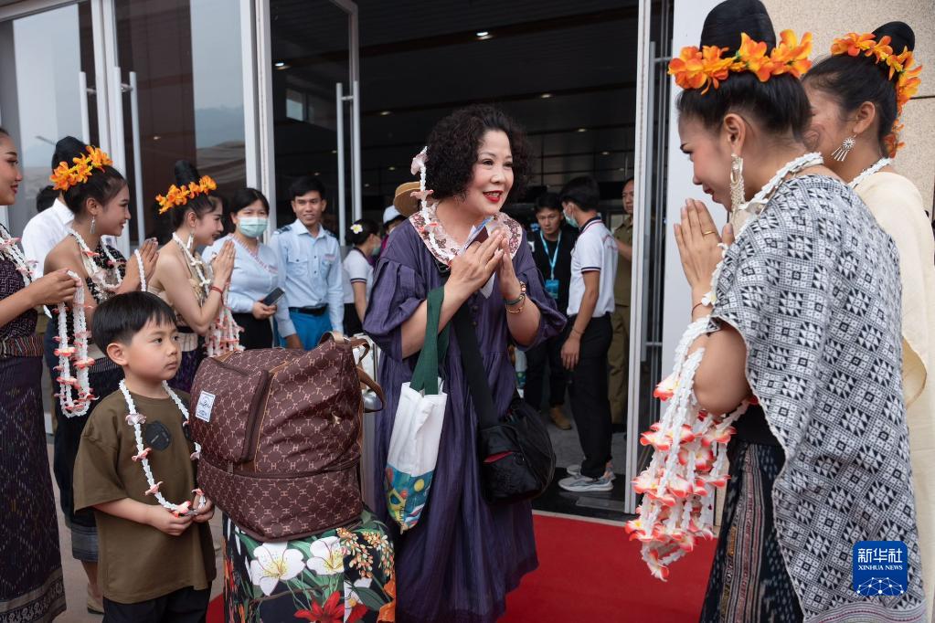 4月13日,在中老鐵路老撾磨丁站,工作人員歡迎乘坐D887次國際旅客列車的旅客抵達(dá)磨丁。