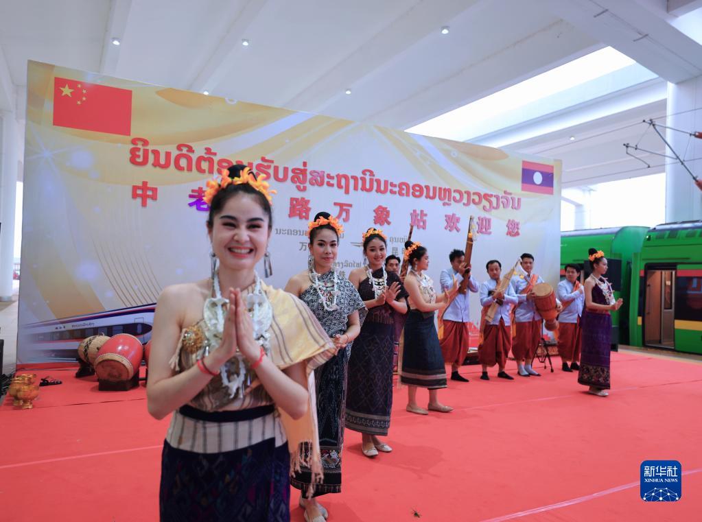 4月13日,在中老鐵路老撾萬象站,工作人員歡迎乘坐D887次國際旅客列車的旅客。