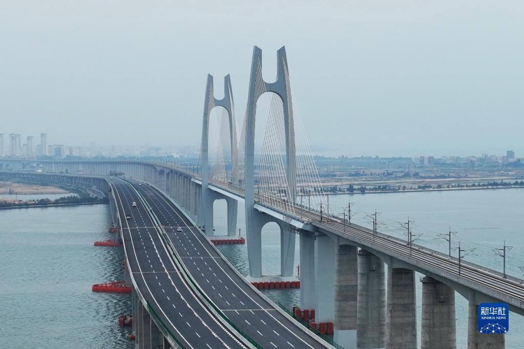 4月12日拍攝的新建福廈鐵路安海灣跨海大橋(右)(無人機照片)。