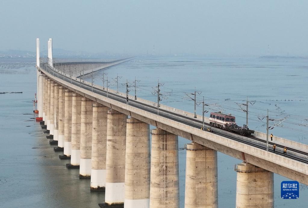 4月11日拍攝的新建福廈鐵路湄洲灣跨海大橋(無人機照片)。