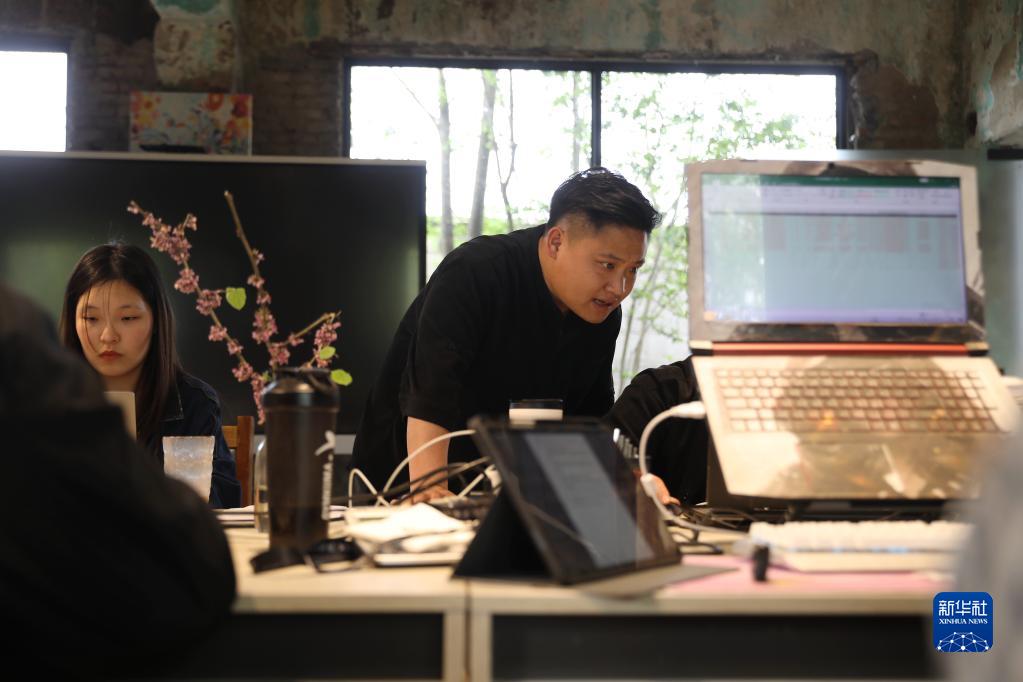 4月12日,程鑠欽和創業團隊成員在辦公室內交流。