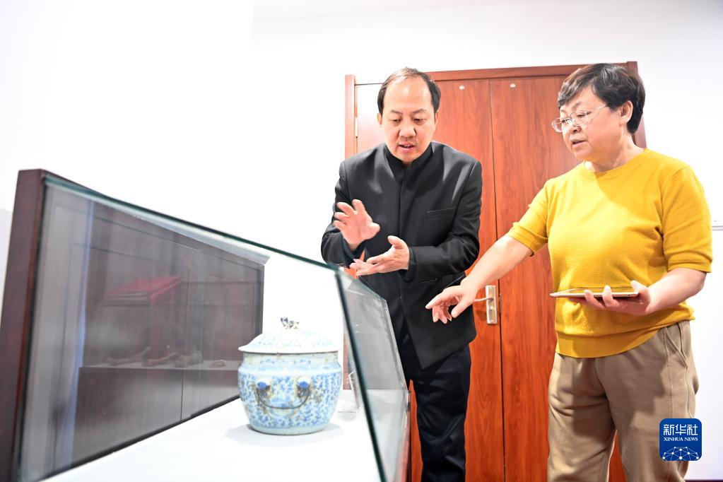 在天津市西青區檔案館,謝連華(左)和工作人員一起查看村里的老物件(4月7日攝)。