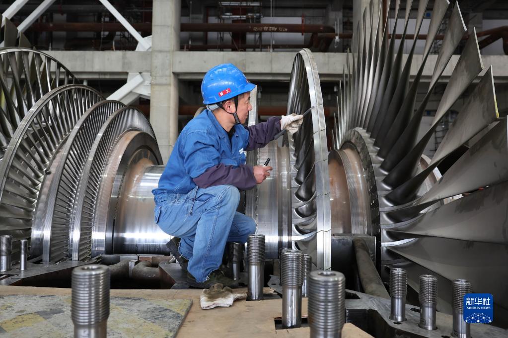 4月13日,一名工人在江蘇省射陽縣射陽港電廠四期百萬千瓦燃煤發(fā)電機(jī)組1號汽輪機(jī)組設(shè)備安裝現(xiàn)場工作。