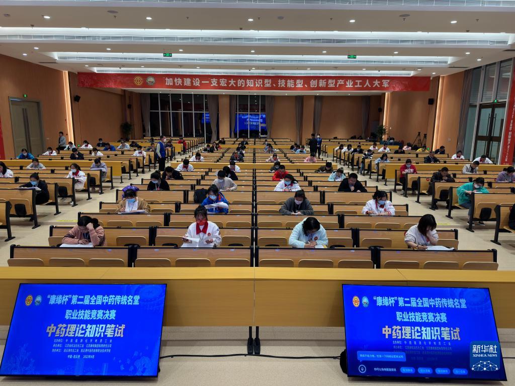 4月12日,在江蘇省連云港市舉行的第二屆全國中藥傳統名堂職業技能競賽決賽上,選手參加中藥理論知識筆試。