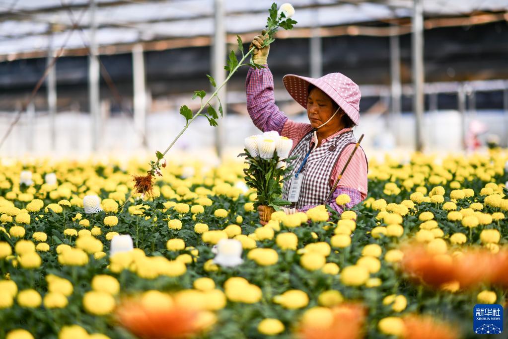 云南省開遠市的花農李蘭英在采摘鮮花(3月22日攝)。