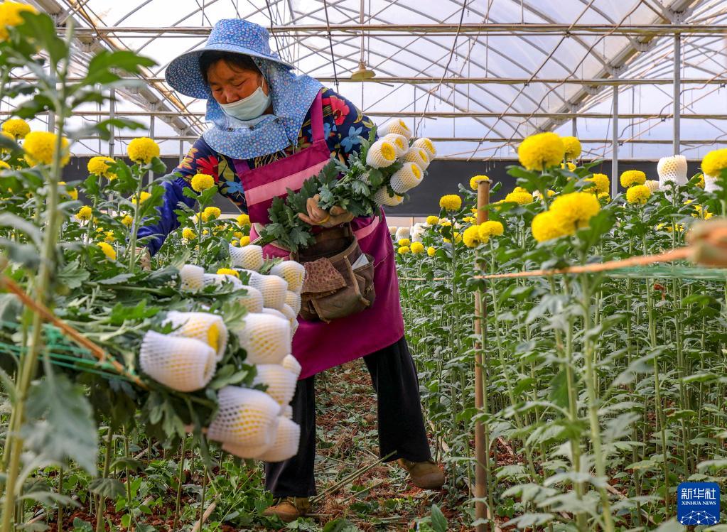 云南省開遠市的花農采摘鮮花(3月22日攝)。