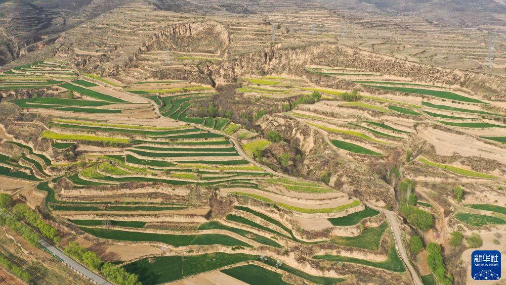 這是4月13日拍攝的甘肅省平涼市崇信縣錦屏鎮境內的梯田(無人機照片)。