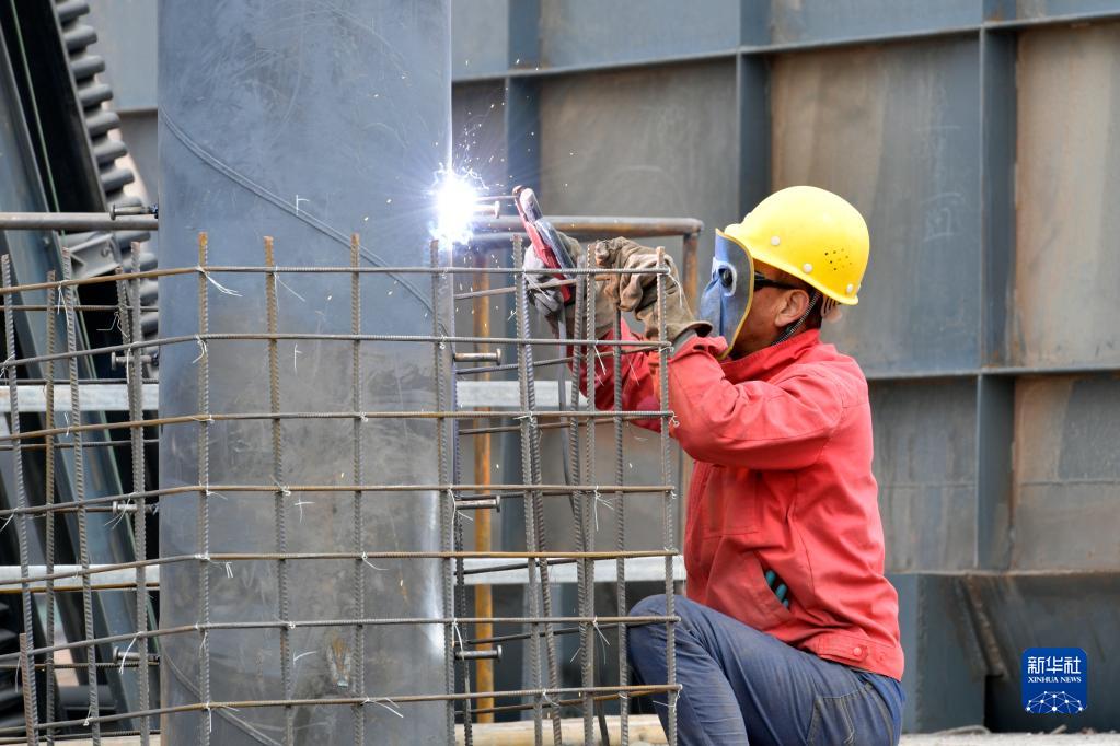 4月13日,工人在位于張掖市甘州區的20萬噸硅系新材料綜合利用項目建設現場施工。