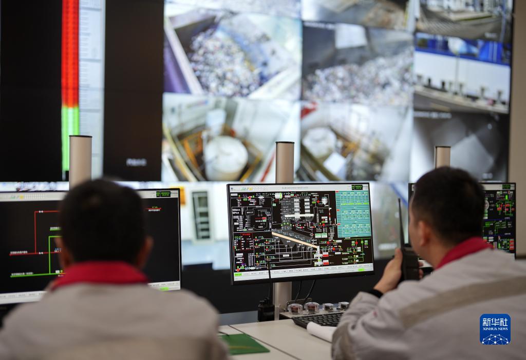 4月13日,工作人員在唐山冀東啟新水泥有限責任公司水泥窯協同處置綜合固廢及余熱發電循環產業項目指揮中心內監控設備運行情況。