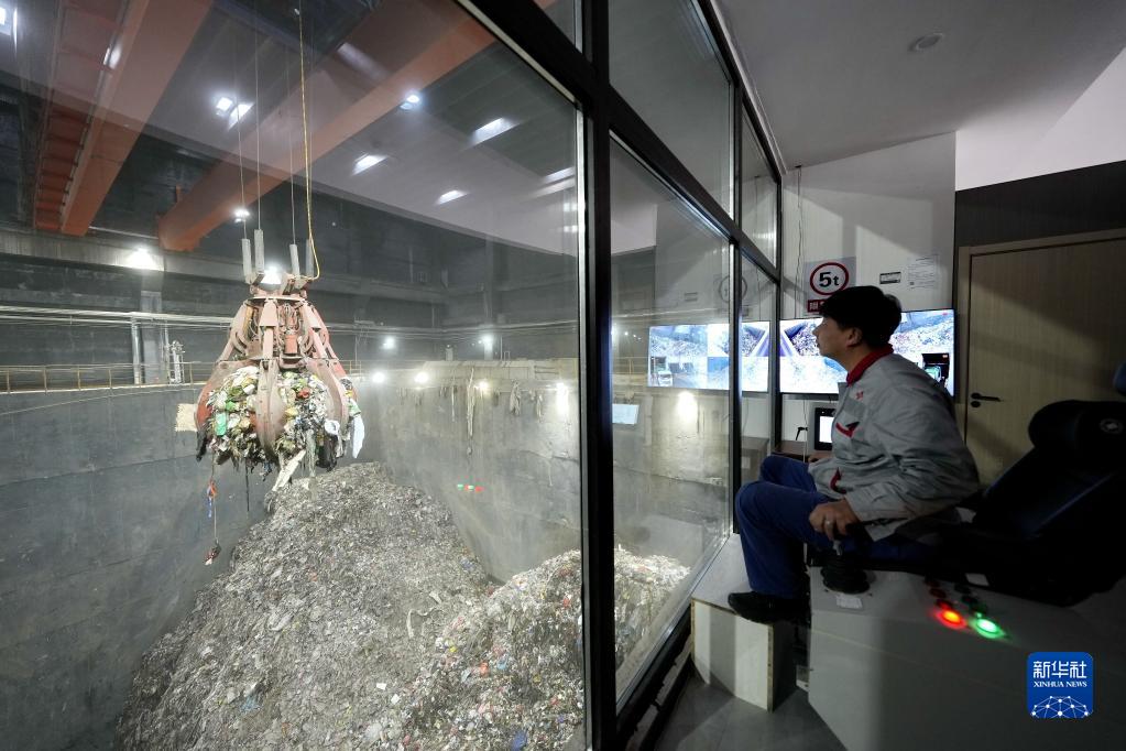 4月13日,工作人員在唐山冀東啟新水泥有限責任公司固廢處置中心內操作機器運輸生活垃圾。