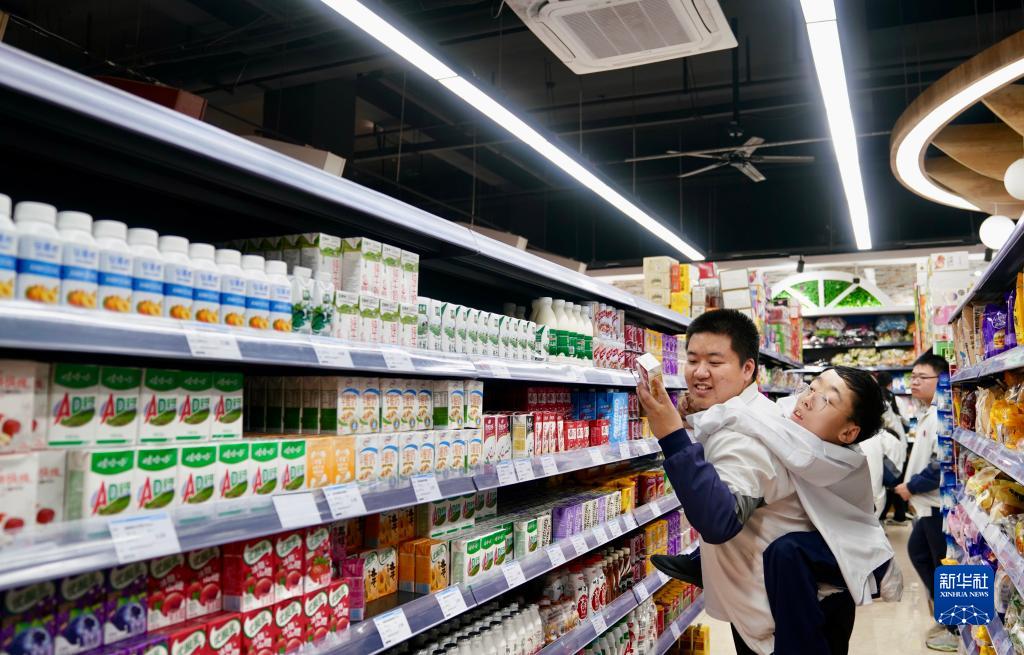 4月12日,朱金祥(左)背著鐘華強(qiáng)在學(xué)校的超市內(nèi)選購商品。