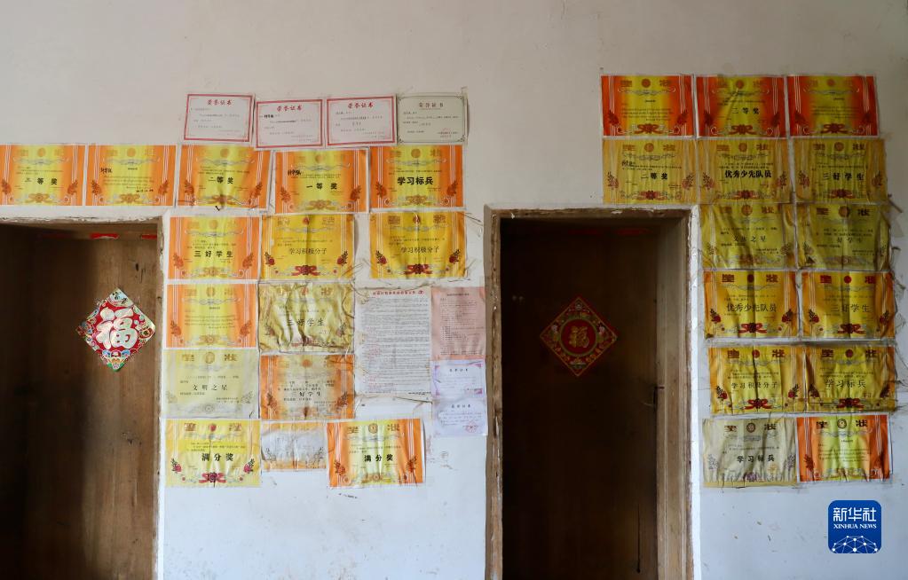 這是鐘華強獲得的部分榮譽證書,張貼在家中的墻壁上(4月13日攝)。
