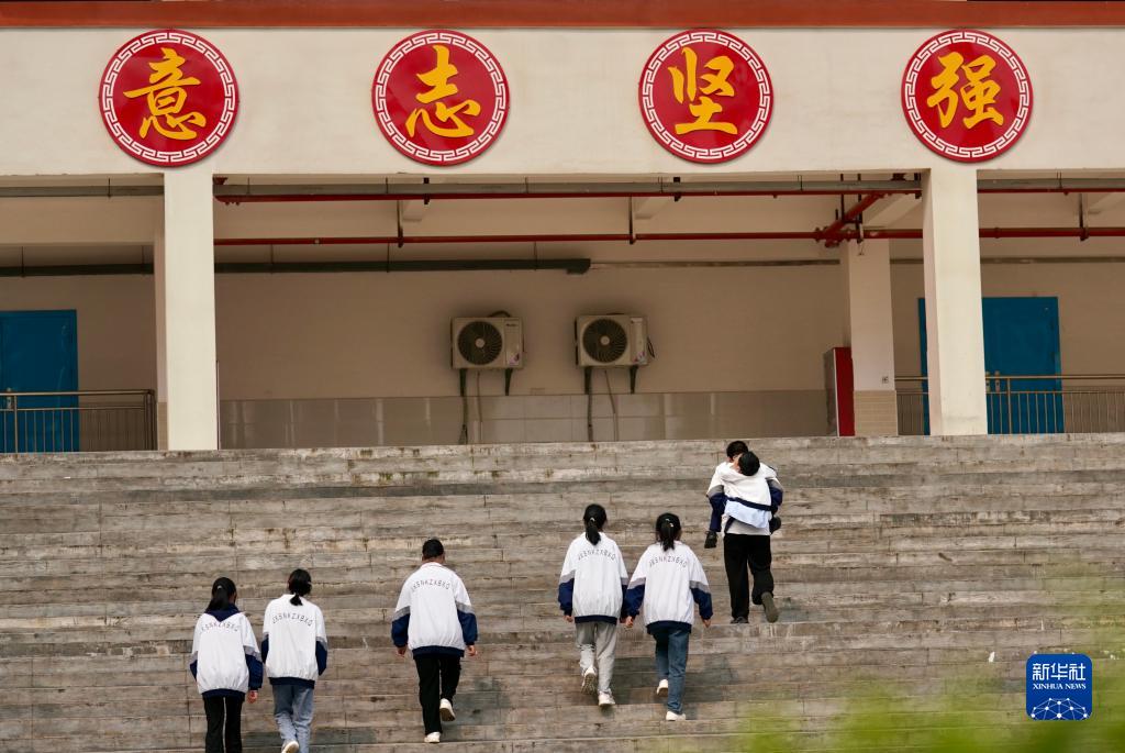 4月13日,朱金祥(右一)背著鐘華強(qiáng)返回教室。