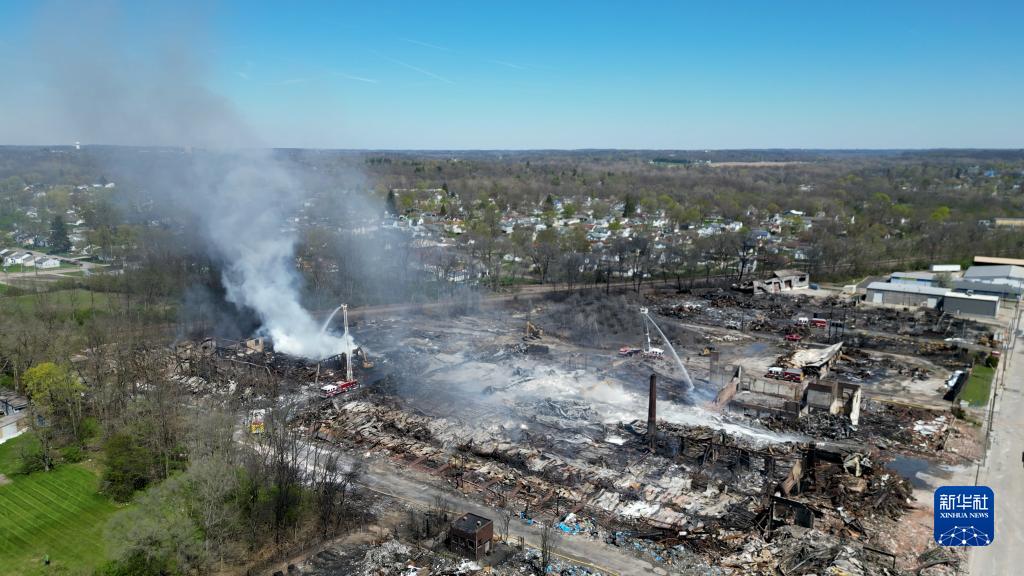 這是4月13日拍攝的美國印第安納州發(fā)生火災(zāi)的回收廠(無人機拍攝)。