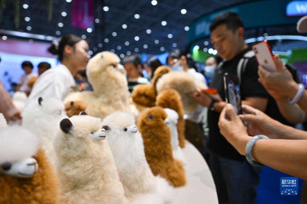 4月14日,觀眾在消博會(huì)現(xiàn)場(chǎng)選購(gòu)羊駝絨玩偶。