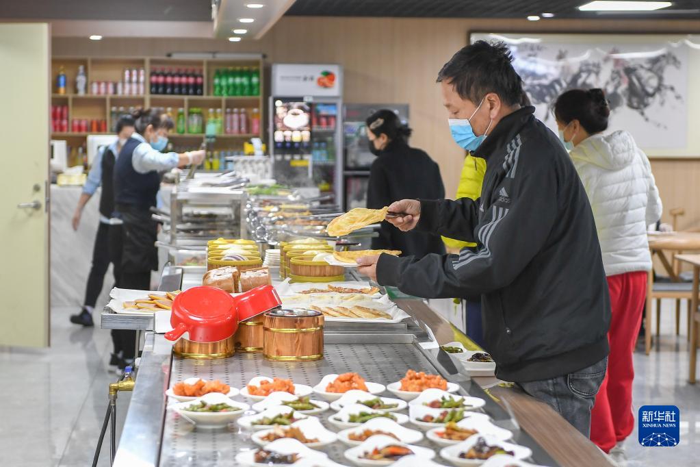 4月11日,在吉林省長春市朝陽區光明社區食堂,市民在挑選菜品。該食堂是吉林省民政廳重點支持的100個社區老年食堂之一。