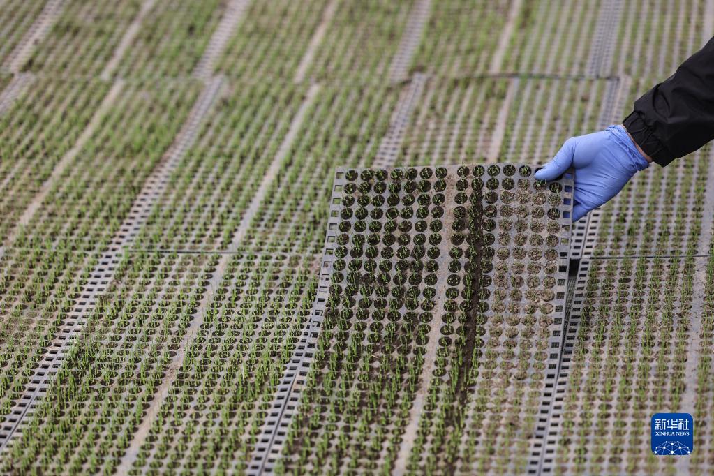 4月14日,盤錦市盤山縣的農戶在查看水稻秧苗的育苗情況。