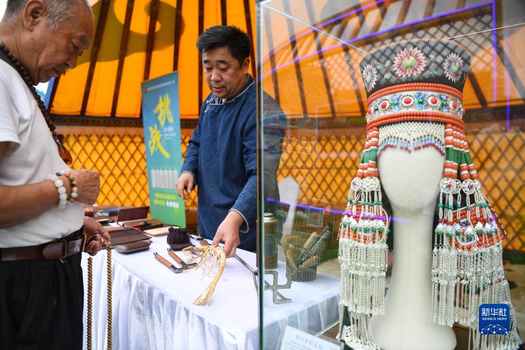 4月14日,在廣東佛山市文華公園,觀眾在了解蒙古族特色商品。