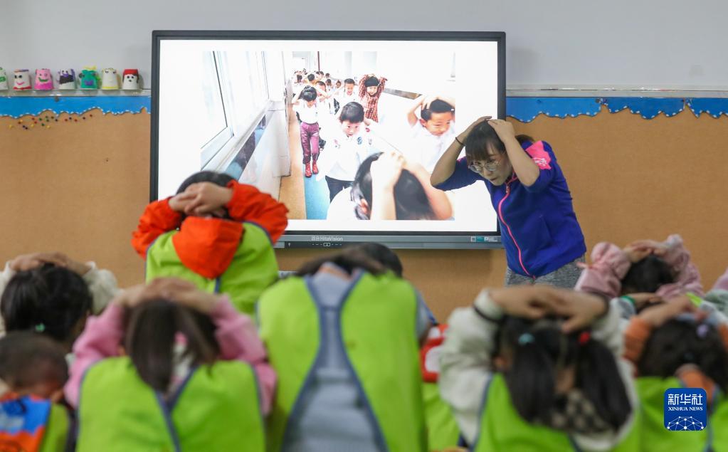 4月14日,在貴州省貴陽市開陽縣第六幼兒園,老師給孩子們示范正確的地震逃生方式。