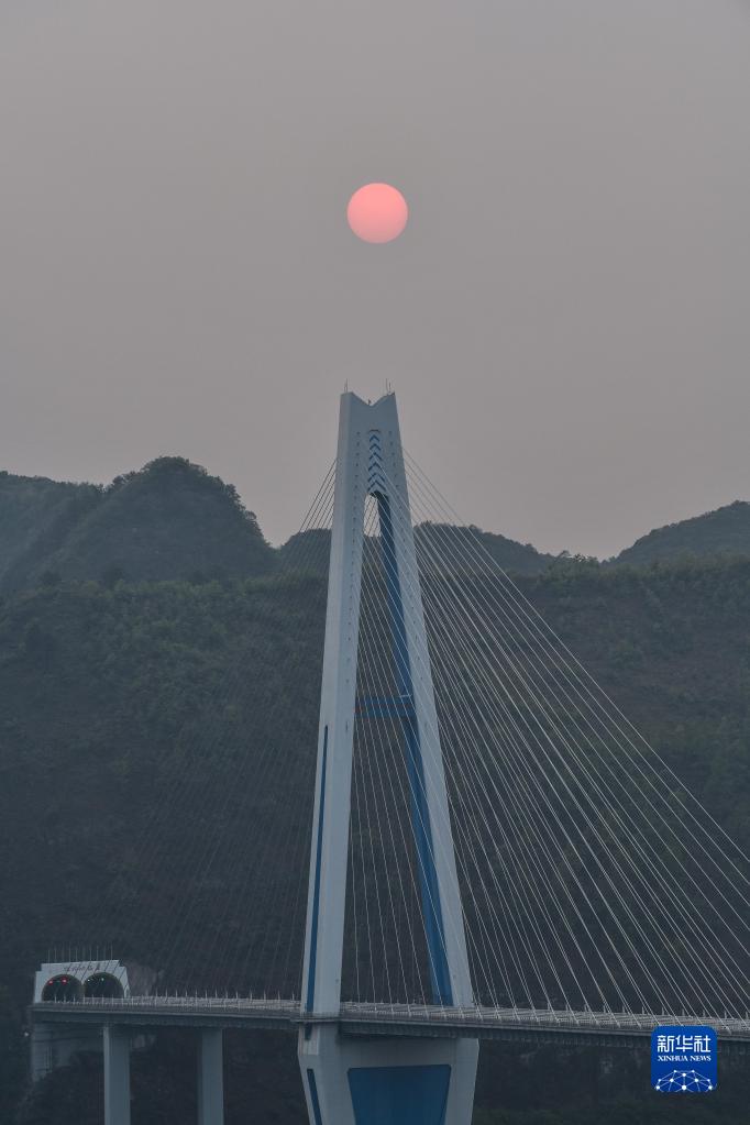 夕陽下的貴州平羅高速公路平塘特大橋(4月13日攝)。
