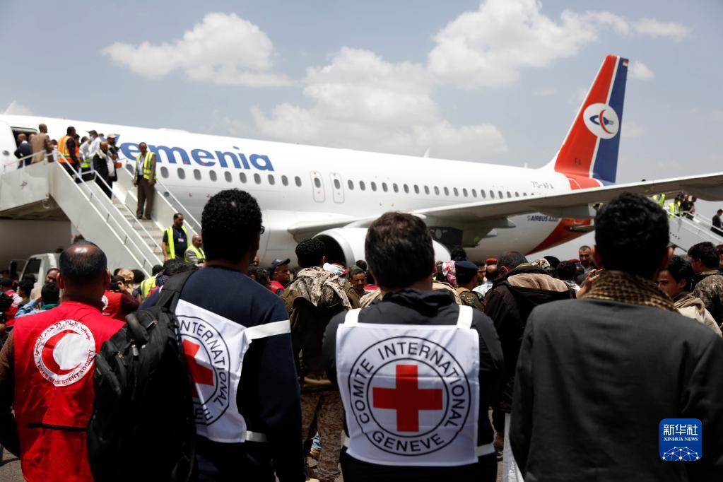 4月14日,搭載獲釋胡塞武裝成員戰(zhàn)俘的飛機抵達也門薩那機場。