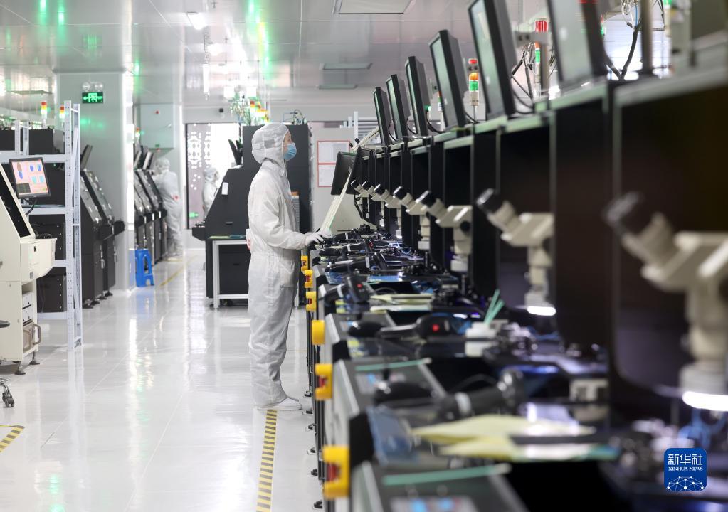 4月14日,一位工人在江蘇省射陽縣江蘇暖陽半導體科技公司LED芯片生產車間工作。