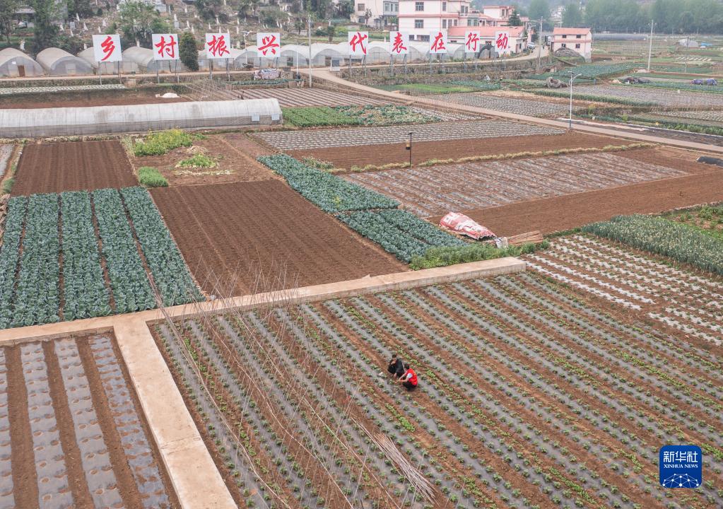 4月14日,農技工作者(身著紅背心)在六盤水市鐘山區大河鎮大橋村和村民交流蔬菜種植情況(無人機照片)。