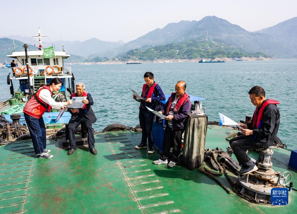 4月15日,湖北省宜昌市生態環境局秭歸縣分局工作人員在秭歸港??康拇吧希瑸榇瑔T發放宣傳單,講解生態環保相關法律知識。