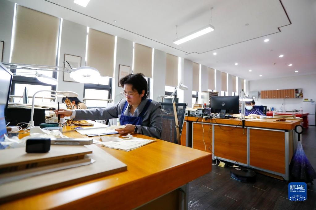 4月14日,在廣西壯族自治區(qū)圖書館古籍保護(hù)中心的工作室內(nèi),黃玉杏正在修復(fù)古籍。