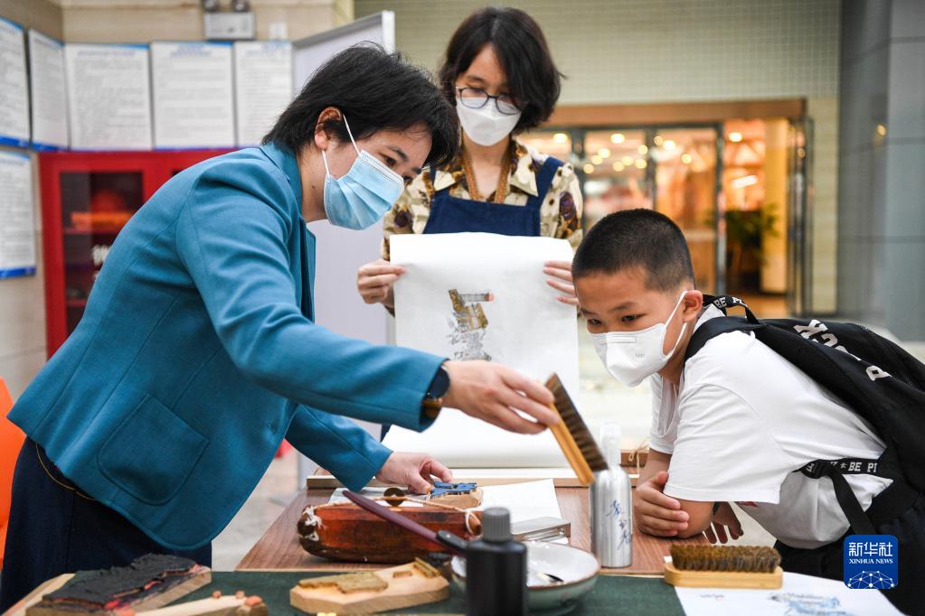 4月15日,在廣西壯族自治區(qū)圖書館,黃玉杏(左)給小讀者講解古籍印刷的有關(guān)知識(shí)。