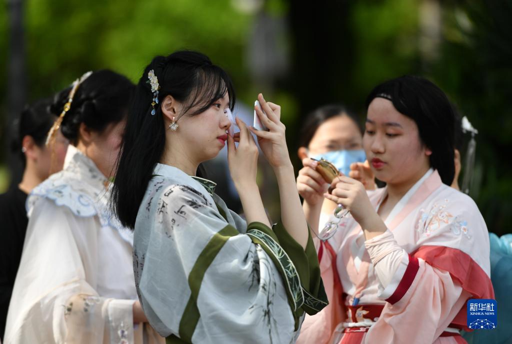 4月15日,在福州西湖上巳節啟動儀式現場,漢服愛好者在進行演出前的妝扮。