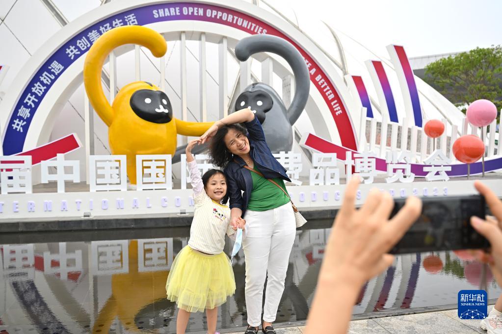4月15日,觀眾在消博會場館外合影留念。