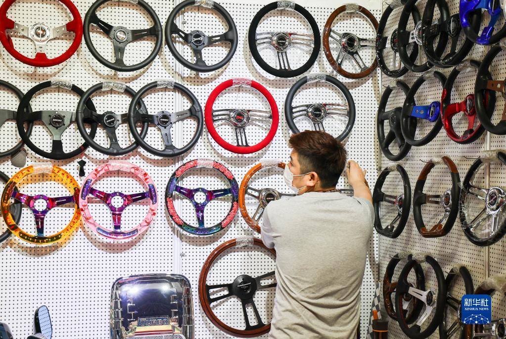 4月15日,參展商在廣交會汽配展區(qū)展示方向盤產品。