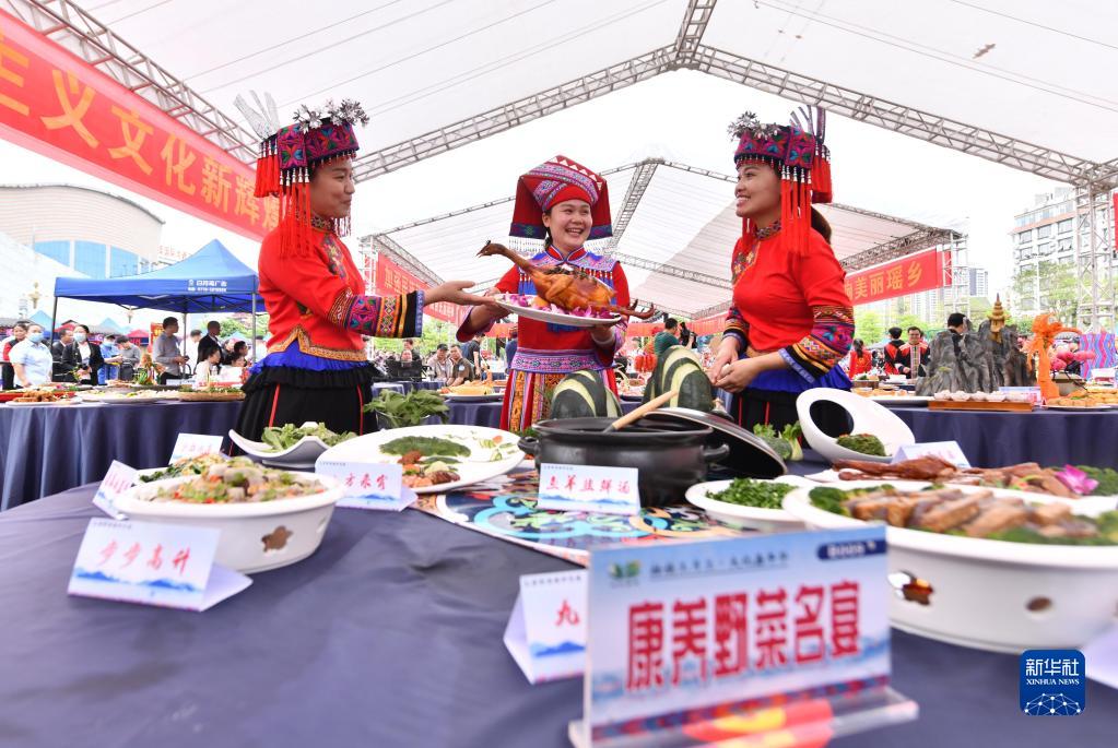 當日,廣西河池市大化瑤族自治縣舉辦“美味三月三”美食大賽,當地各族群眾以糯米、七百弄雞、山羊、河魚等當地特色食材制作的數百道美食參加評比。