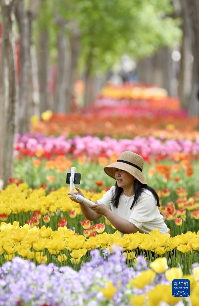 當日,北京永定河綠色港灣郁金香文化節在大興區北臧村鎮開幕,100余萬株各式花卉競相開放,游客徘徊其間宛如游弋在七彩花海。