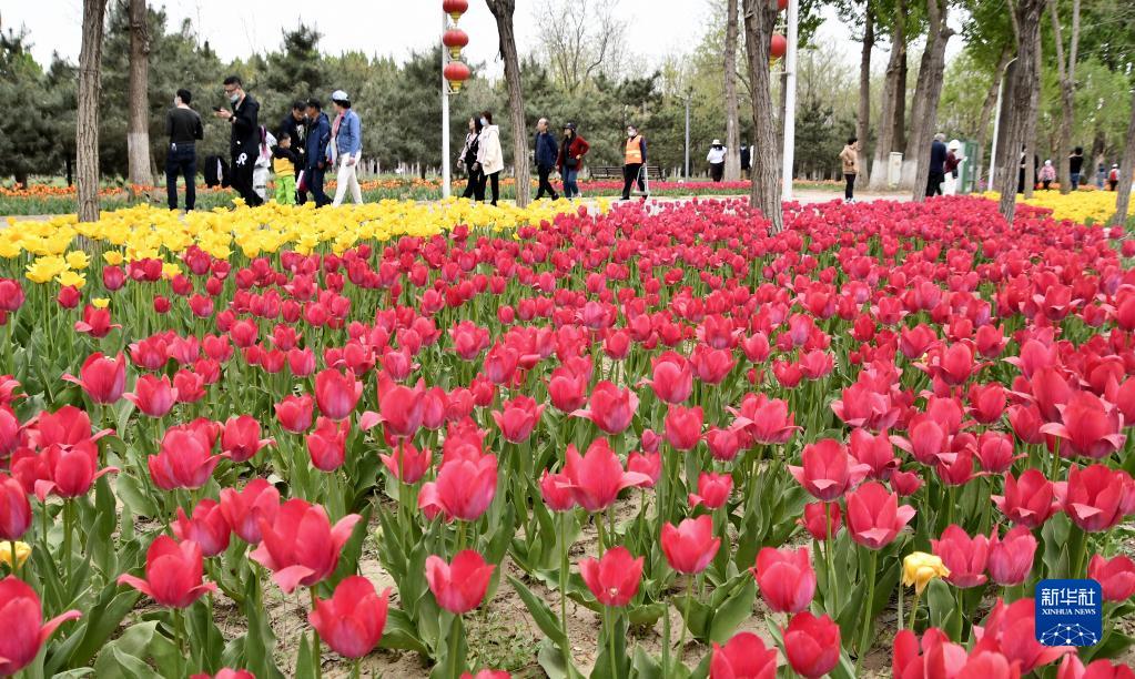 當(dāng)日,北京永定河綠色港灣郁金香文化節(jié)在大興區(qū)北臧村鎮(zhèn)開幕,100余萬株各式花卉競相開放,游客徘徊其間宛如游弋在七彩花海。