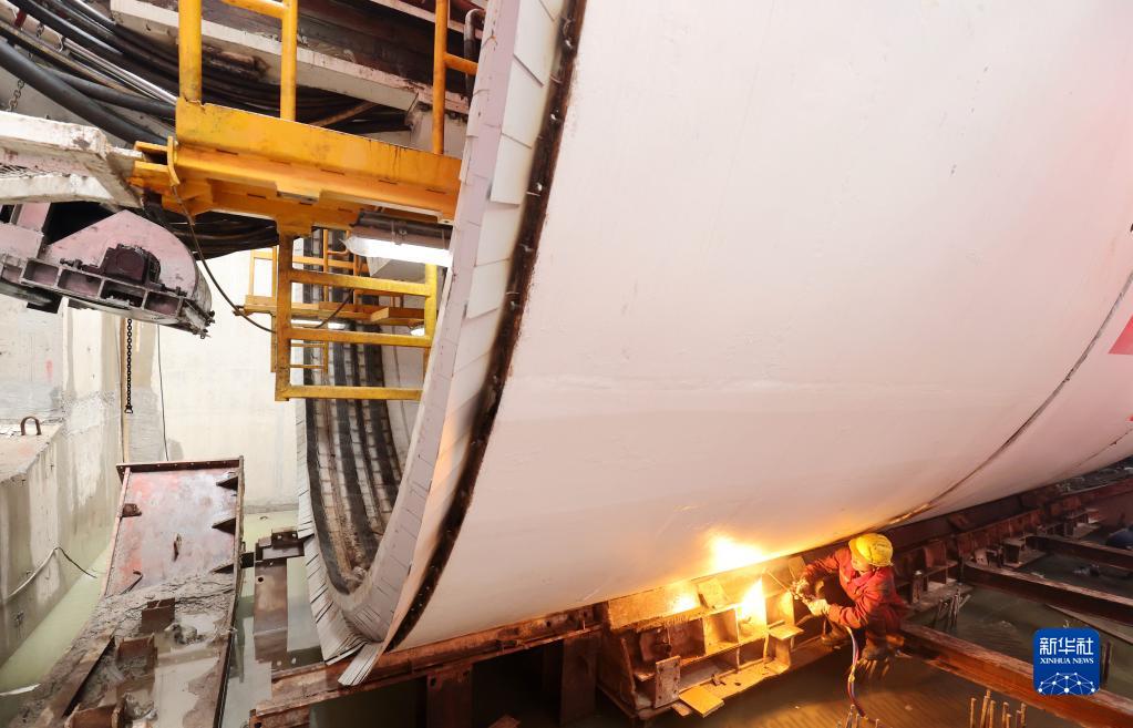 4月15日,湖州市德清縣杭德市域鐵路隧道工程施工現場,中國中鐵股份有限公司的工人在安裝調試盾構機設備。