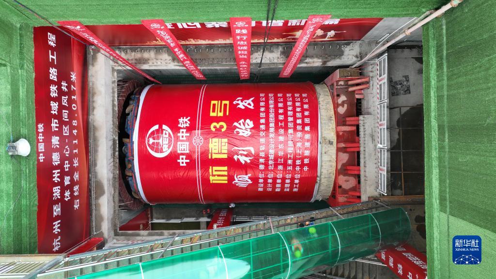4月15日,浙江省湖州市德清縣杭德市域鐵路隧道工程施工現(xiàn)場(chǎng),盾構(gòu)機(jī)在掘進(jìn)作業(yè)(無(wú)人機(jī)照片)。