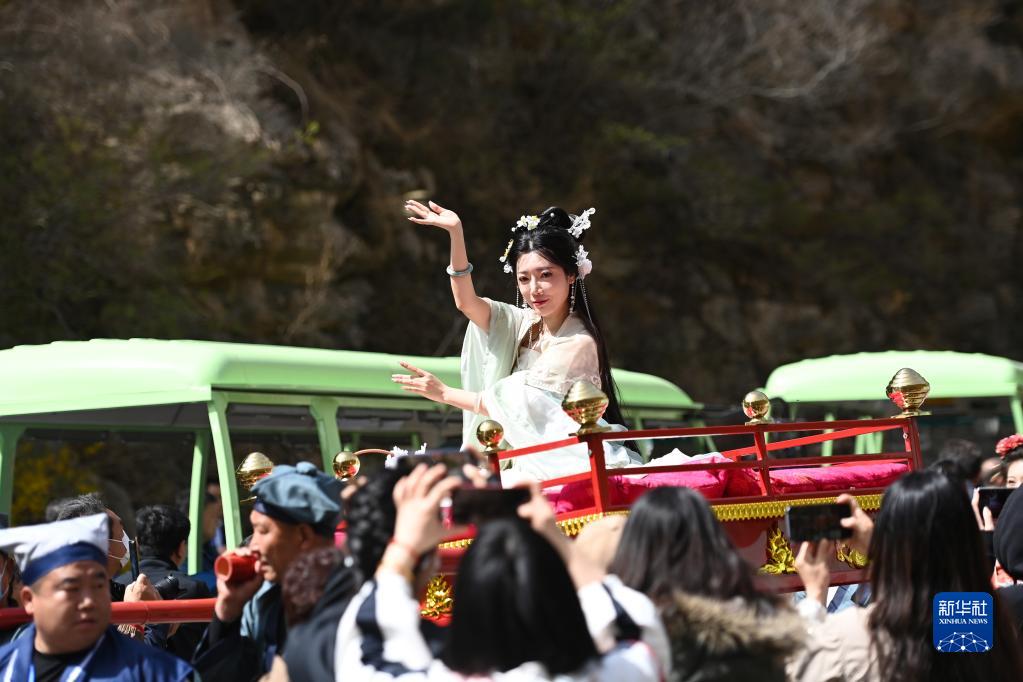 4月15日,游客在天津市薊州區梨木臺景區觀看漢服表演。
