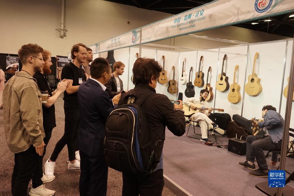 4月13日,在美國加利福尼亞州阿納海姆會展中心,參觀者在中國貴州正安吉他產業園一家公司展位觀看樂器表演。