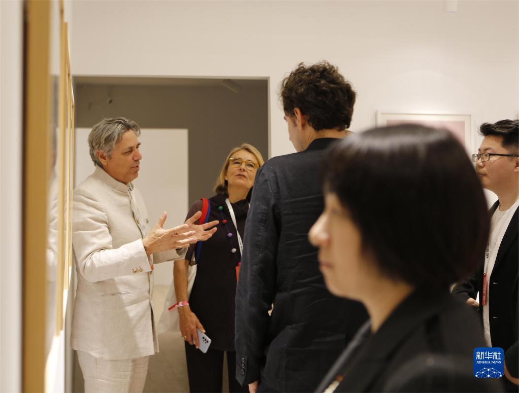 4月15日,受邀嘉賓在“2023第六屆蘇州·金雞湖雙年展”上參觀、討論藝術作品。