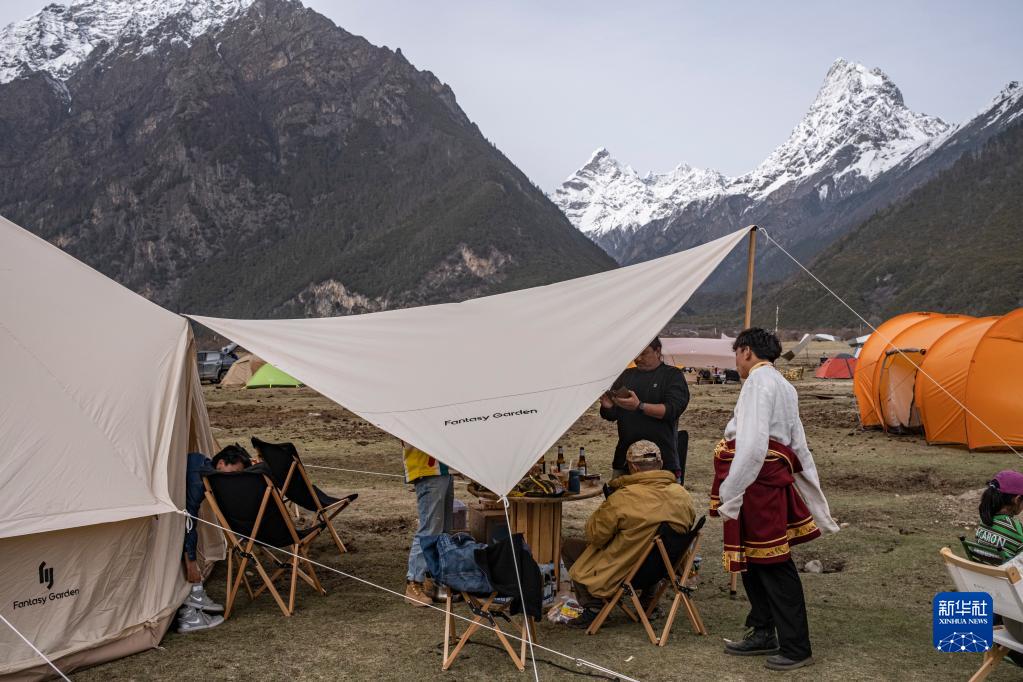 4月15日,游客在巴松措附近體驗露營生活。