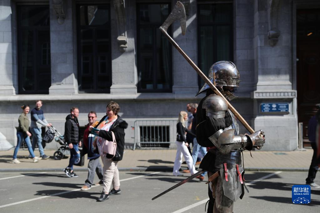4月15日,一名身著盔甲的演員在比利時那慕爾市傳統民俗日活動上行進。