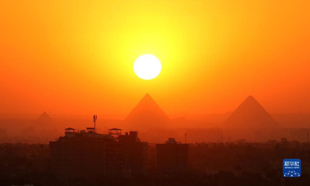 這是4月15日在埃及開羅拍攝的吉薩金字塔群日落景色。