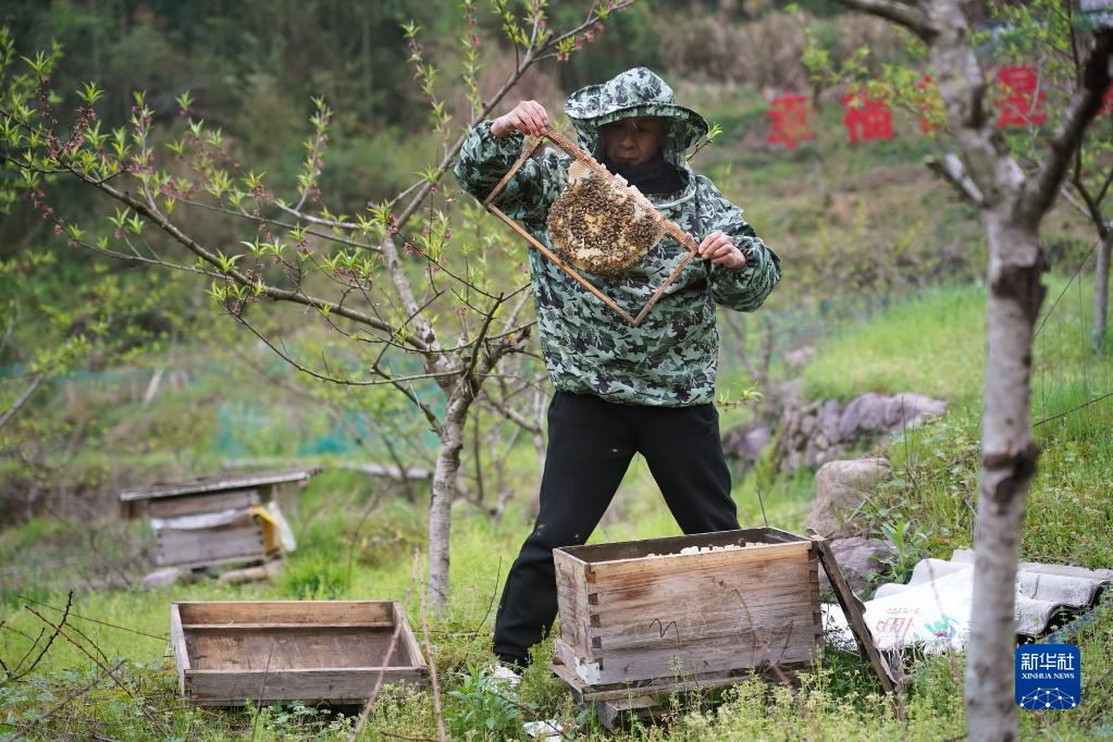 村黨支部書記吳竹林在查看蜂箱(4月6日攝)。
