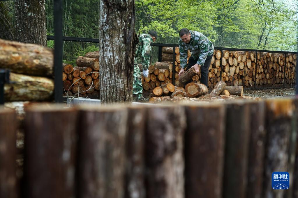 村民劉煌平(右)用木頭搭建旅游步道的護欄(4月6日攝)。